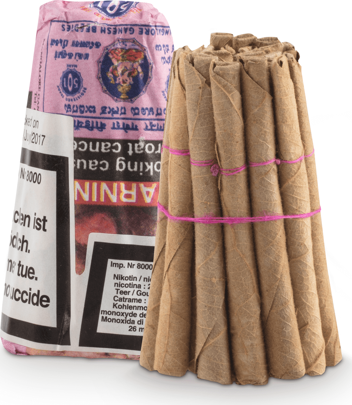 Cigarette indienne faite à la main. La feuille de l'arbuste tendue tropical sert de page de couverture et enveloppe le tabac.
