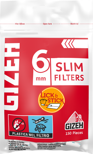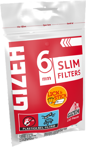 Die GIZEH Slim Filter sind Eindrehfilter mit einem Durchmesser von 6 mm. Um das Drehen zu erleichtern, verfügen die Filter über eine Klebefläche, die mit Lebensmittelfarbe markiert ist.